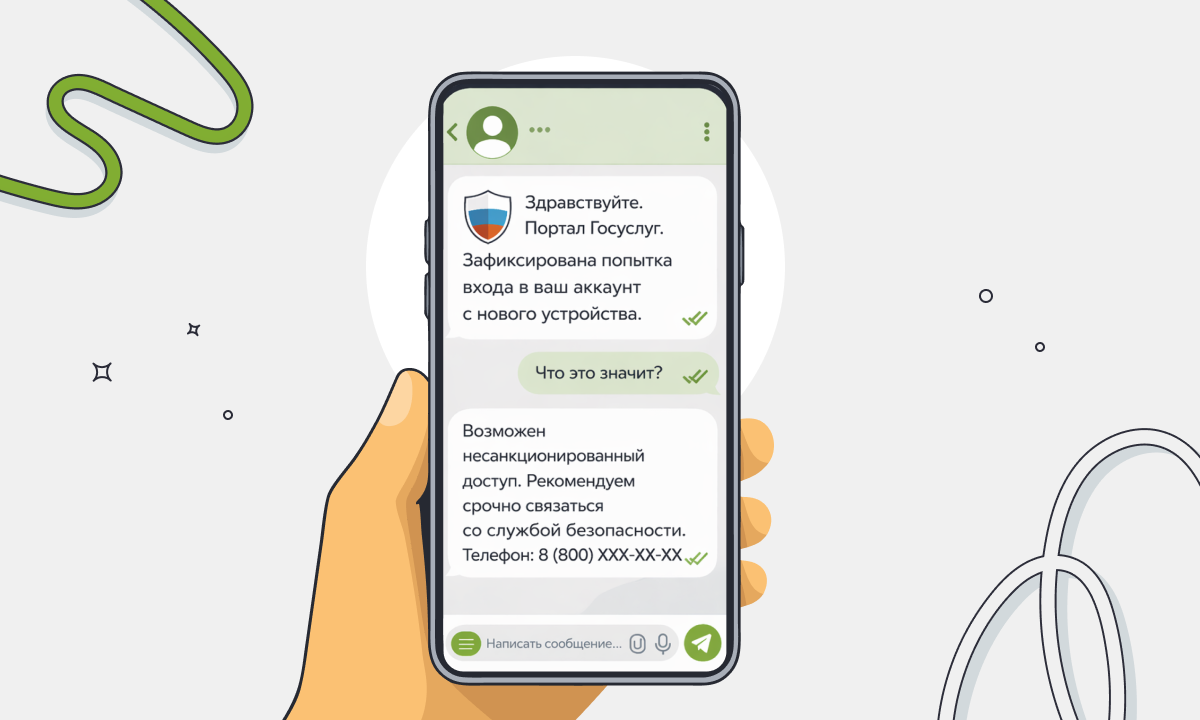 Взлом аккаунта Госуслуг. Пользователь получает сообщение о взломе аккаунта на портале Госуслуг и просьбу срочно позвонить по указанному номеру. Звонок попадает в поддельный колл-центр, где мошенники представляются службой поддержки и просят назвать коды подтверждения — якобы для проверки аккаунта на Госуслугах, но на самом деле для входа в него.