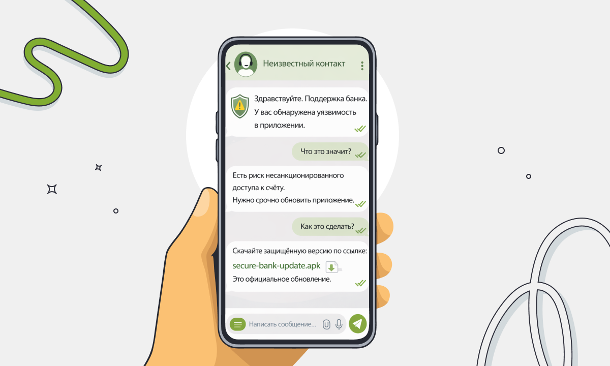 Установка официального приложения. Пользователю предлагают установить приложение от банка или госслужбы. На самом деле это поддельное приложение с вредоносной программой: она перехватывает вводимые данные, записывает экран и предоставляет удалённый доступ к устройству. Так злоумышленники получают прямой контроль над аккаунтами и операциями.