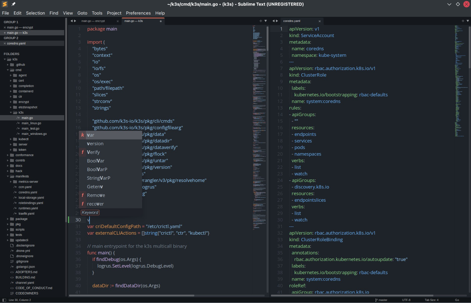 Интерфейс редактора довольно стандартный для подобных инструментов: слева расположено дерево проекта со всеми папками, а справа — рабочая зона. Каждый файл открывается в отдельной вкладке. Можно настроить сплит-окно, в котором одновременно будут отображаться несколько вкладок. Также поддерживает мультиселектор — одновременное выделение нескольких строк.