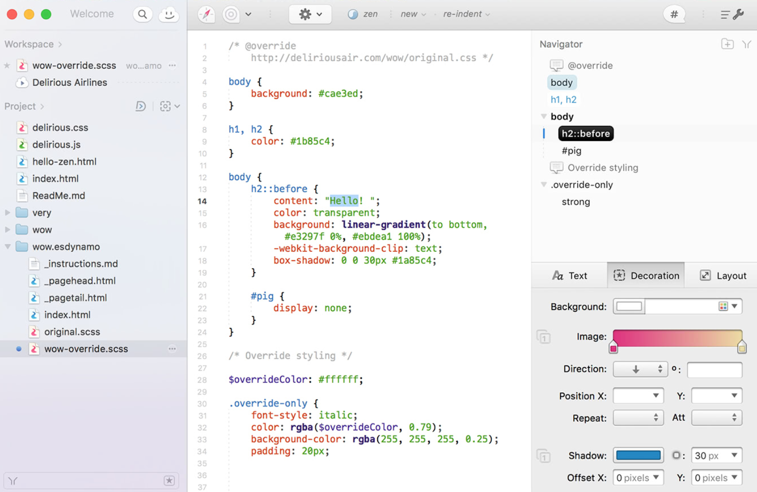 Одна из ключевых возможностей Espresso — инструмент CSSEdit. Он позволяет настраивать цвета, градиенты, тени и другие CSS-свойства с помощью кнопок и ползунков. Еще одна заметная особенность — предпросмотр верстки HTML. Пока разработчик работает с файлами, ПО автоматически рендерит результат «на лету», позволяя видеть изменения сразу. Дополнительно в программе есть инструменты для синхронизации с сервером и быстрой выгрузки изменений на хостинг.