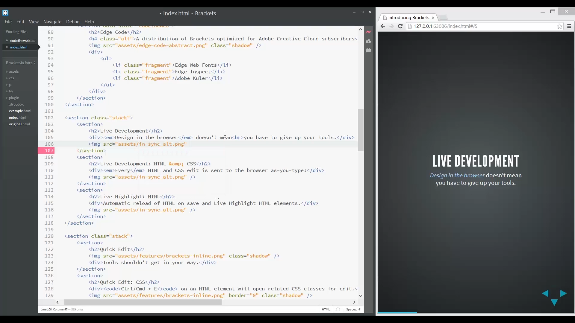 Интерфейс у Brackets минималистичный и не перегруженный. Слева — дерево проекта со всеми файлами и папками, а по центру — рабочая область. Возможностей «из коробки» может оказаться недостаточно для более сложных задач. Например, чтобы добавить поддержку Git или настроить быструю загрузку исходников на хостинг, потребуется установка дополнительных расширений. Еще одна особенность этого редактора кода — режим Live Preview, Это окно предпросмотра, которое рендерит весь HTML-код «на лету». В остальном, ПО ничем не отличается от аналогичных решений.