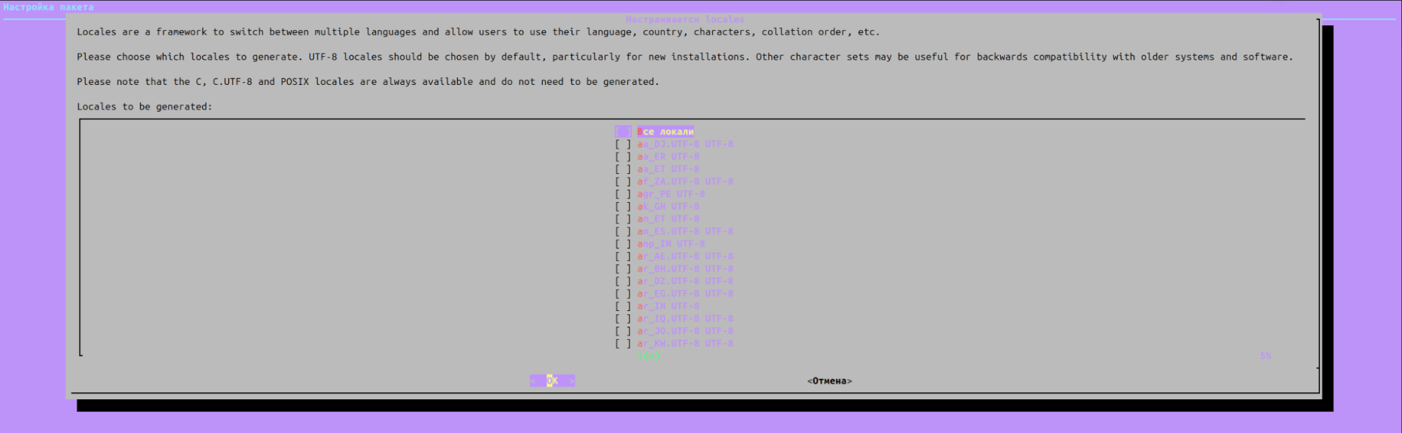 dpkg-reconfigure localesОткроется интерактивное диалоговое окно, где нужно установить необходимое значение региональных настроек.