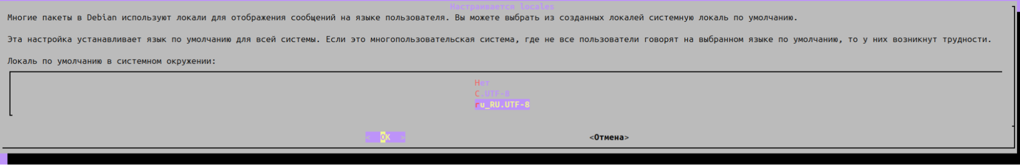После выбора локалей для генерации система предложит выбор локали по умолчанию в системном окружении: