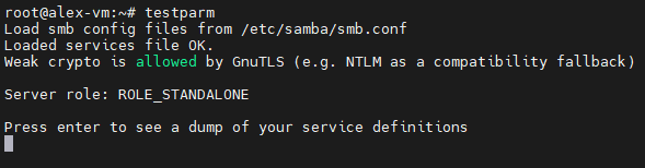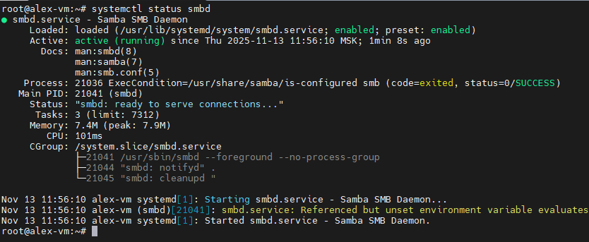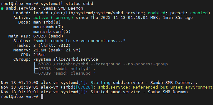 apt update && apt -y install samba smbclient- Проверьте статус сервиса Samba: