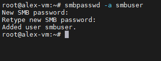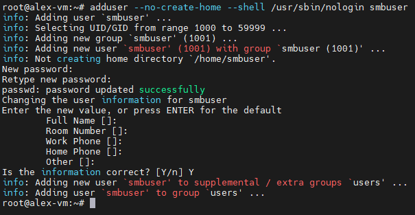 - При создании пользователя нужно установить для него пароль. Однако Samba не может использовать системный пароль пользователя напрямую, поскольку работает по протоколу SMB/CIFS. Он применяет для аутентификации NTLM-хеши, несовместимые с хешами паролей в Unix. Поэтому пароль будет использоваться только при аутентификации в Samba-ресурсах и не будет изменён для системного пользователя.
