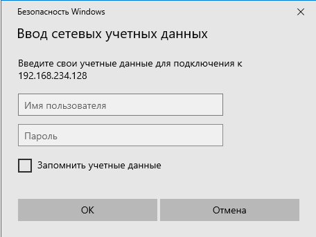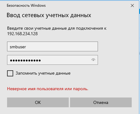 - При появлении окна с вводом учётной записи введите логин smbuser и пароль, который вы задали при использовании утилиты smbpasswd: