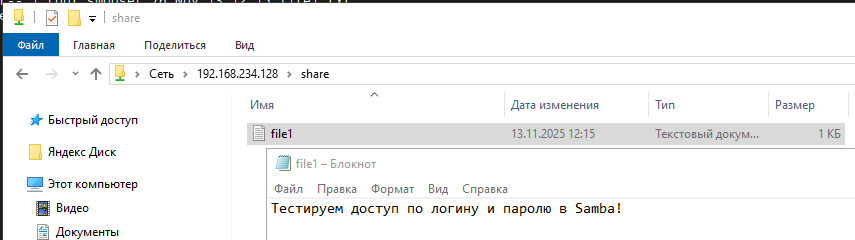 echo “Тестируем доступ по логину и паролю в Samba!” > file1.txt- Перед тем, как редактировать конфигурационный файл