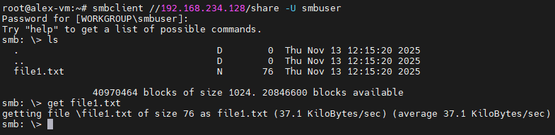 Чтобы подключиться к ресурсу из Linux, используйте утилиту smbclient. Пример команды для подключения к Samba-серверу 192.168.234.128 под учётной записью smbuser: