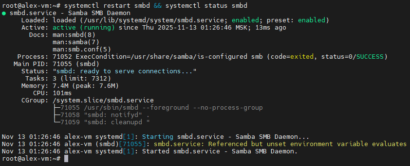 systemctl restart smbd- Для проверки удалите ранее созданный файл