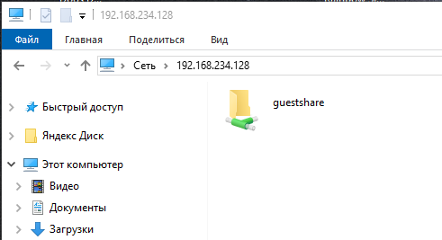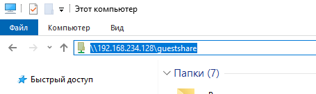 - Откройте проводник и в адресной строке введите IP-адрес сервера и имя ресурса guestshare. Вместо IP-адреса