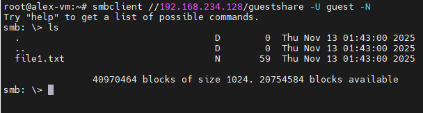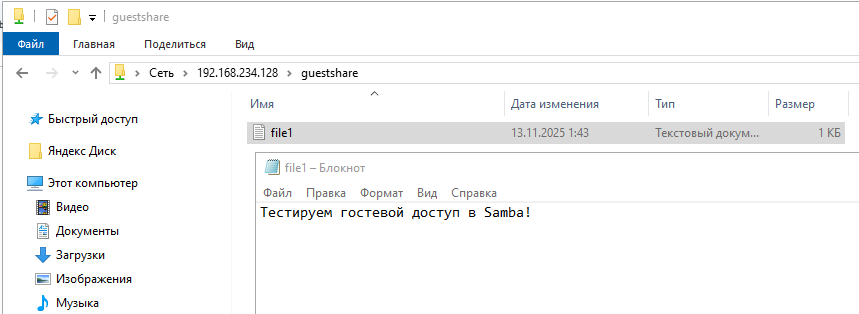 echo "Тестируем гостевой доступ в Samba!" > file1.txtВ дальнейшем все файлы и каталоги необходимо создавать в папке /srv/samba/share.