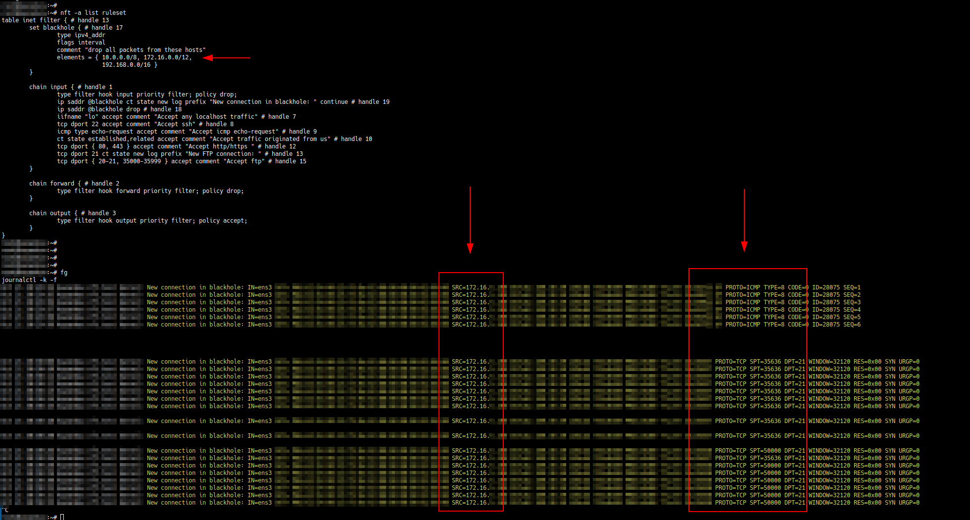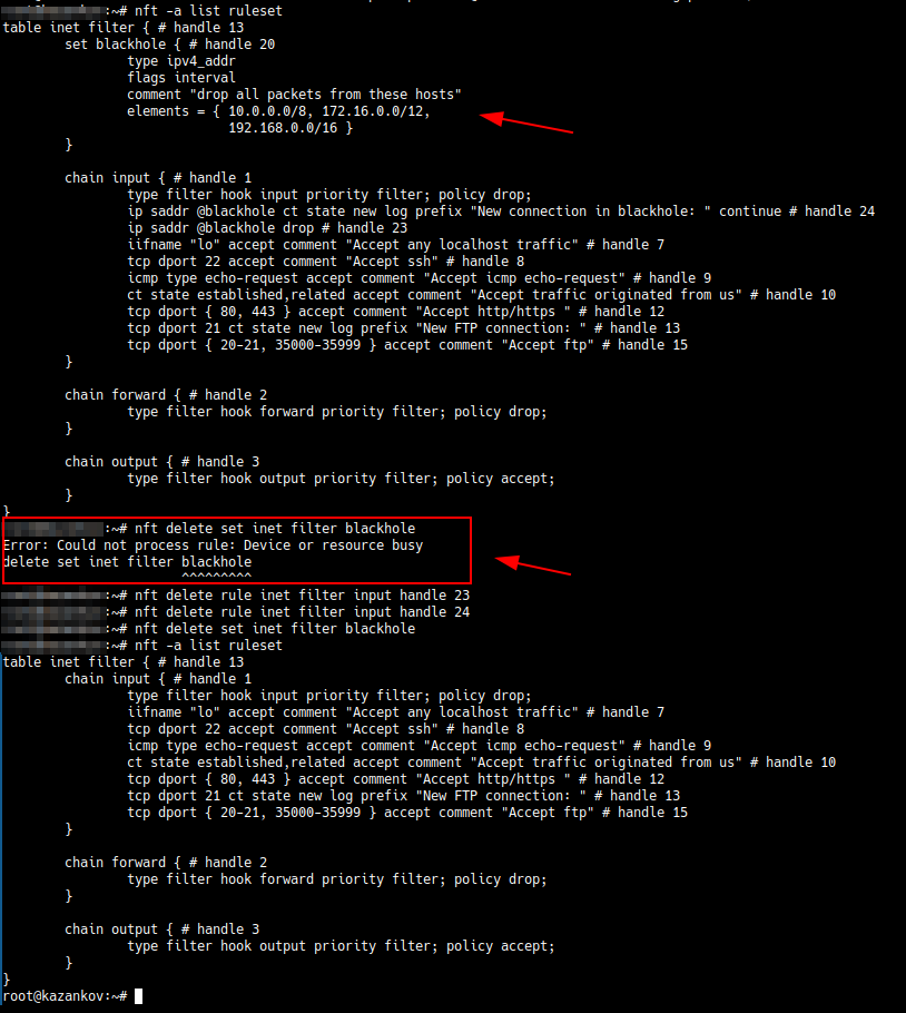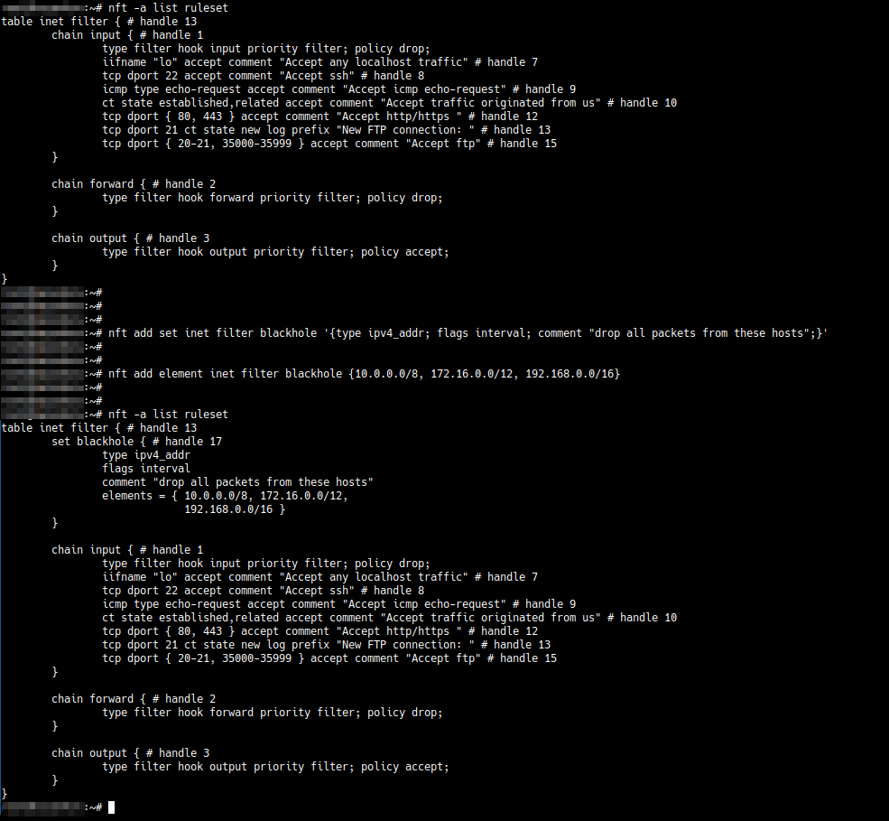 nft add element inet filter blackhole {10.0.0.0/8, 172.16.0.0/12, 192.168.0.0/16}Вывод правил до и после добавления множества на сервере будет выглядеть следующим образом: