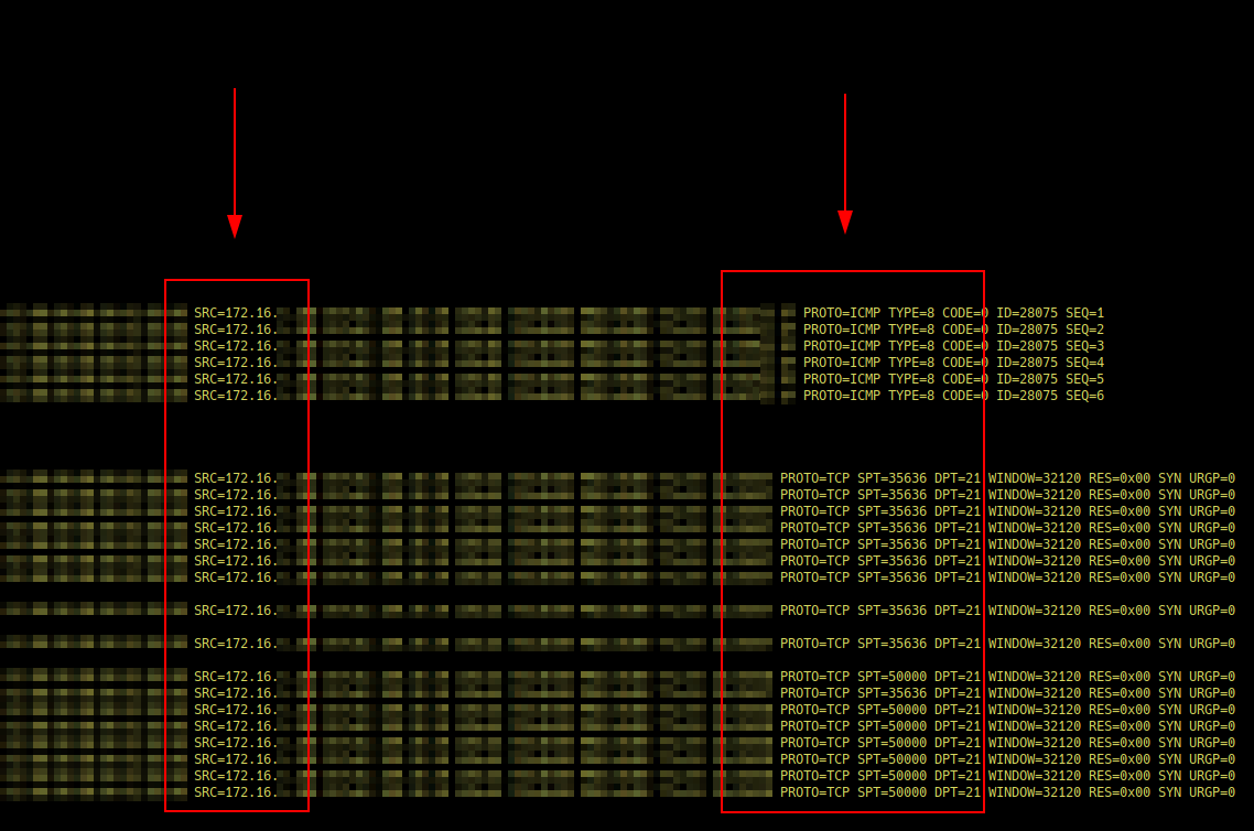 Теперь попробуем подключиться из приватной сети по SSH, FTP и выполнить запросы ping. В логах сервера все такие подключения будут детально записаны с указанием типа (ICMP или конкретный порт).