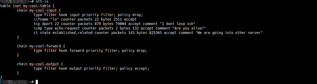 Но, как мы ранее упоминали, ничто не мешает изменить названия цепочек и таблиц на другие, поскольку поведение цепочек определяется хуками (hook input/forward/output) и типами (type filter). Если определённые типы или хуки фреймворка netfilter не задействованы ни в одной цепочке, то пакеты будут проходить через эти цепочки без обработки. Это отличает nftables от iftables.