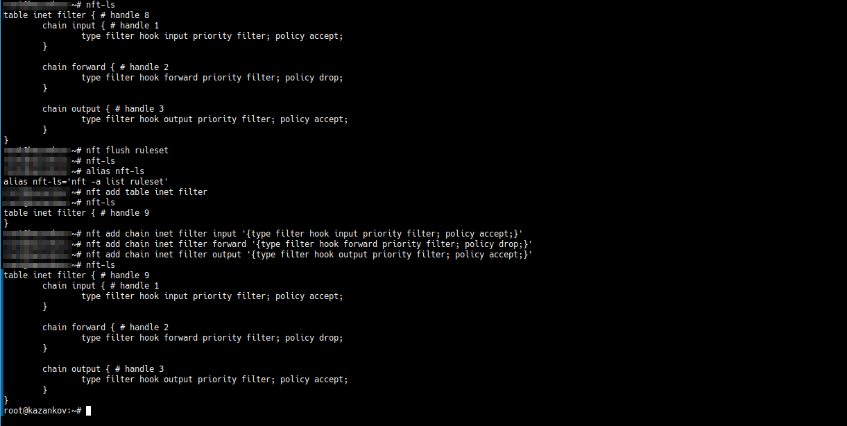 Сейчас правила, которые мы добавляли ранее, в nftables выглядят так: