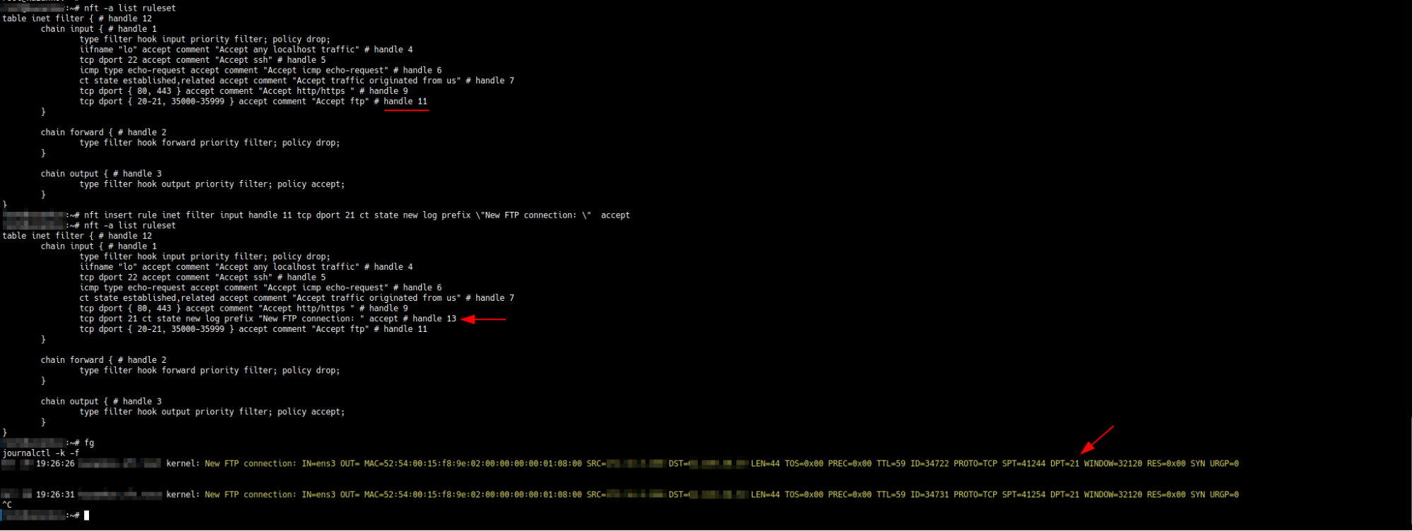 Для примера добавим логирование подключений к ftp и поставим его прямо перед правилом для портов ftp (в нашем случае — handle 11):