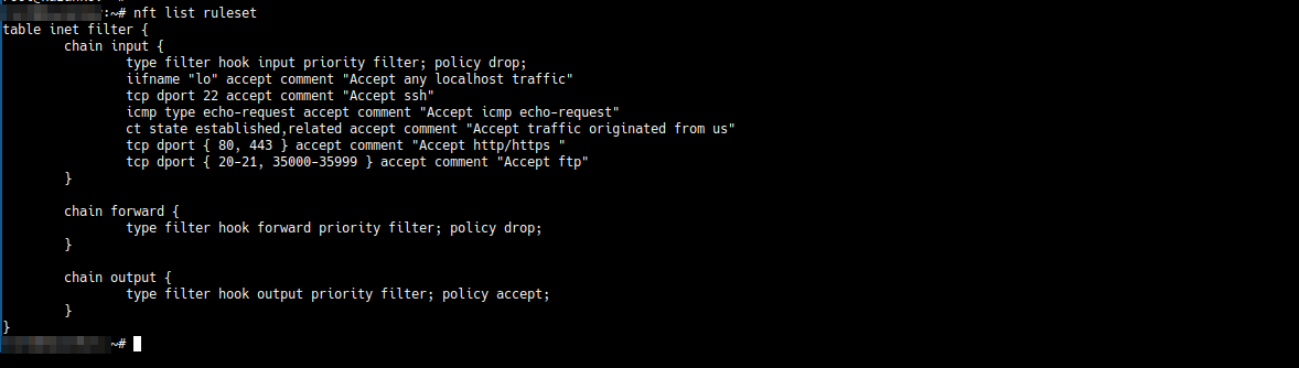 После добавления правил можно заблокировать доступ к серверу для остальных портов и служб, которые не попали в правила, указав политику drop. Nftables будет работать по принципу «запрещено всё, что не разрешено явно».