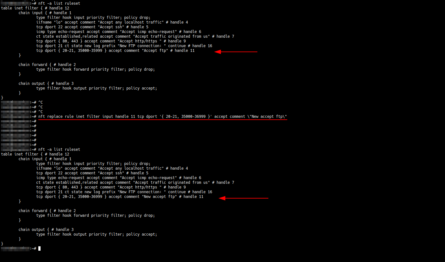 nft replace rule inet filter input handle 11 tcp dport '{ 20-21, 35000-36999 }' accept comment \"New accept ftp\"