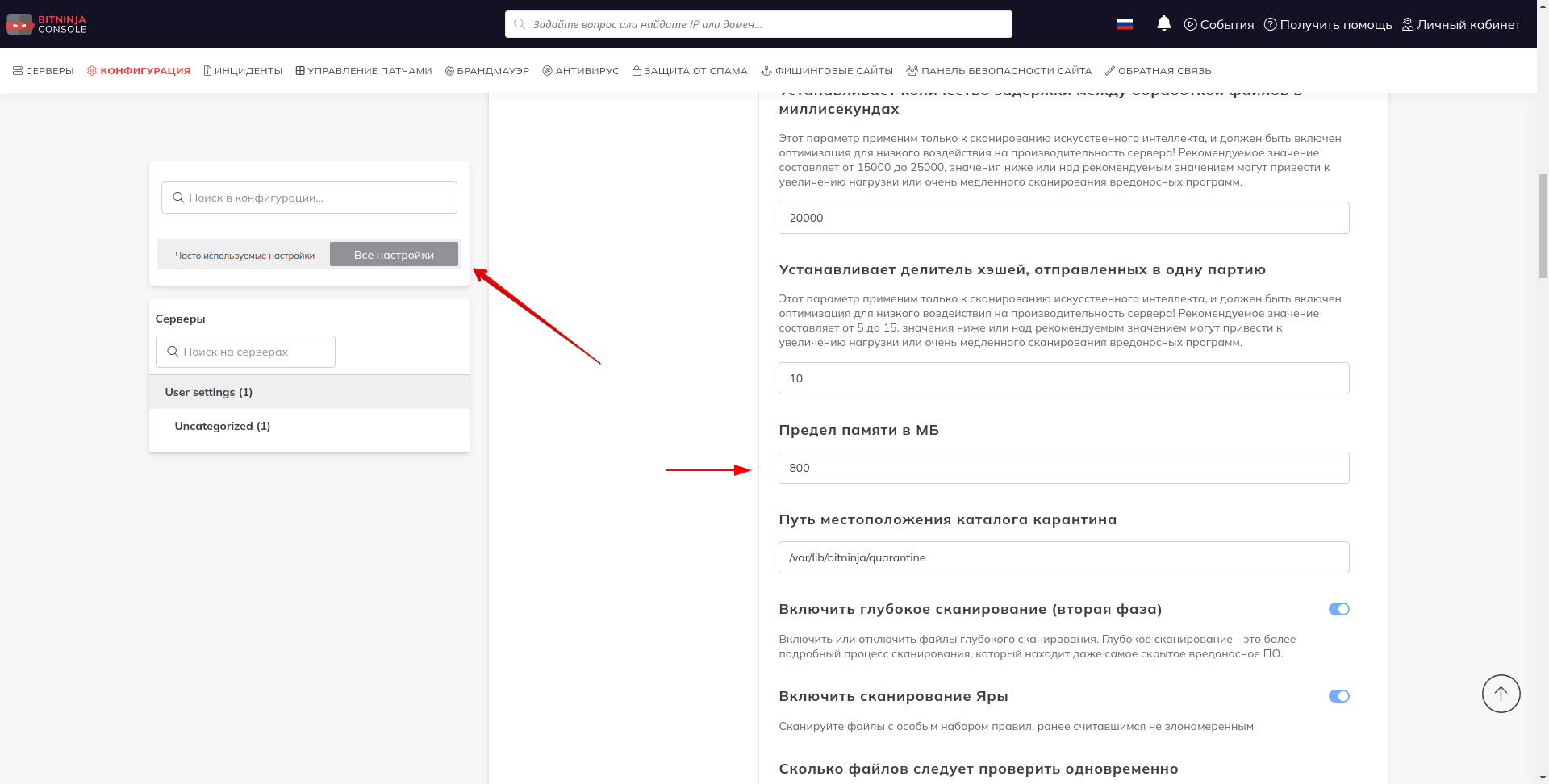 Конфигурация → Обнаружение вредоносных программ → Предел памяти в МБ