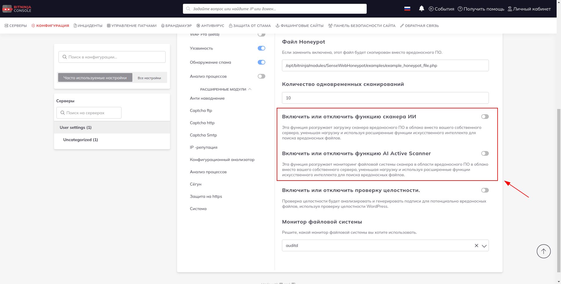 Конфигурация → Обнаружение вредоносных программ → Включить или отключить функцию сканера ИИ