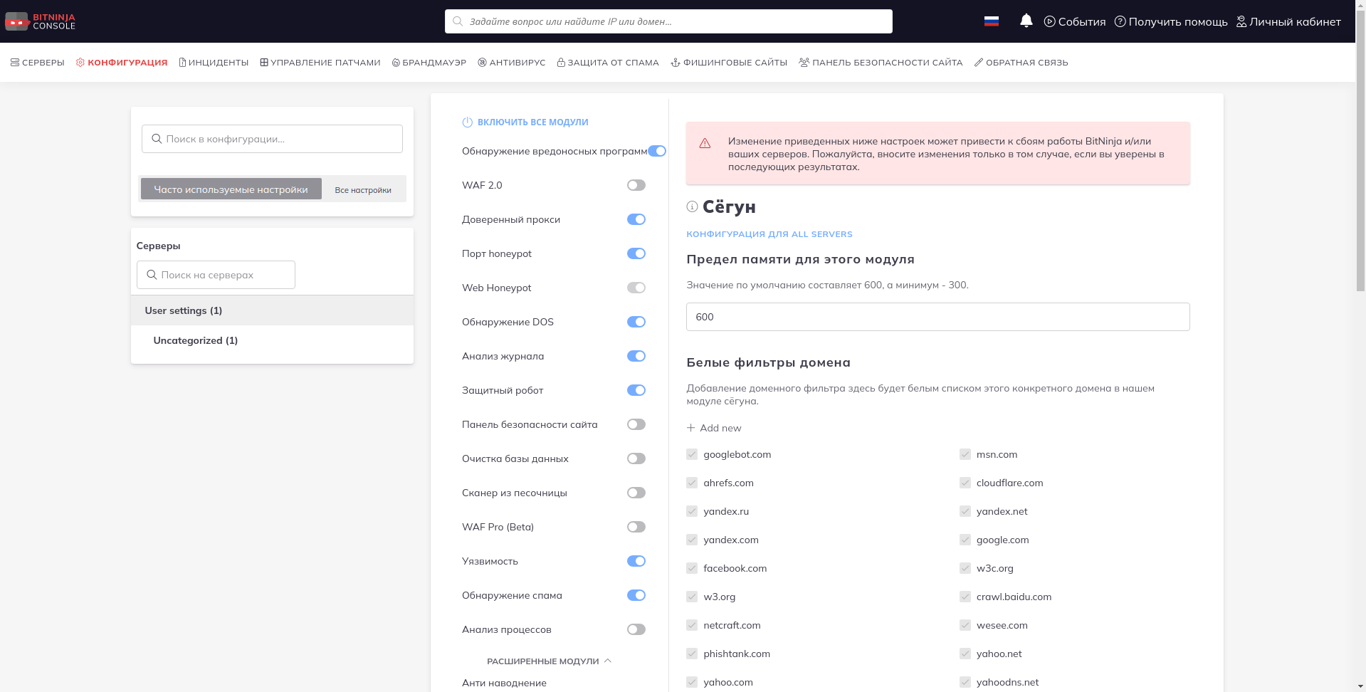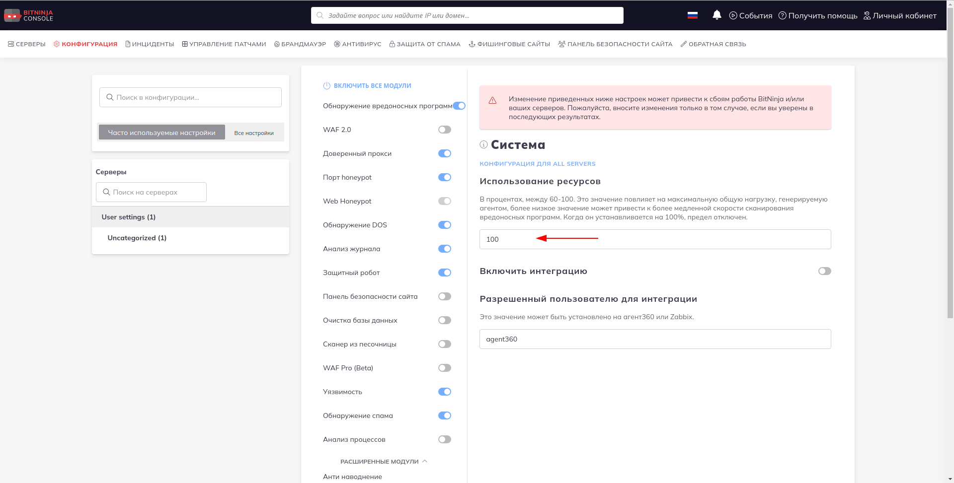 Стоит сразу отметить, что нельзя ограничить работу модулей WAF, HAproxy, BitNinja Dispatcher и BitNinja-mq. Поэтому перед их включением убедитесь, что ваш сервер справится с дополнительной нагрузкой.