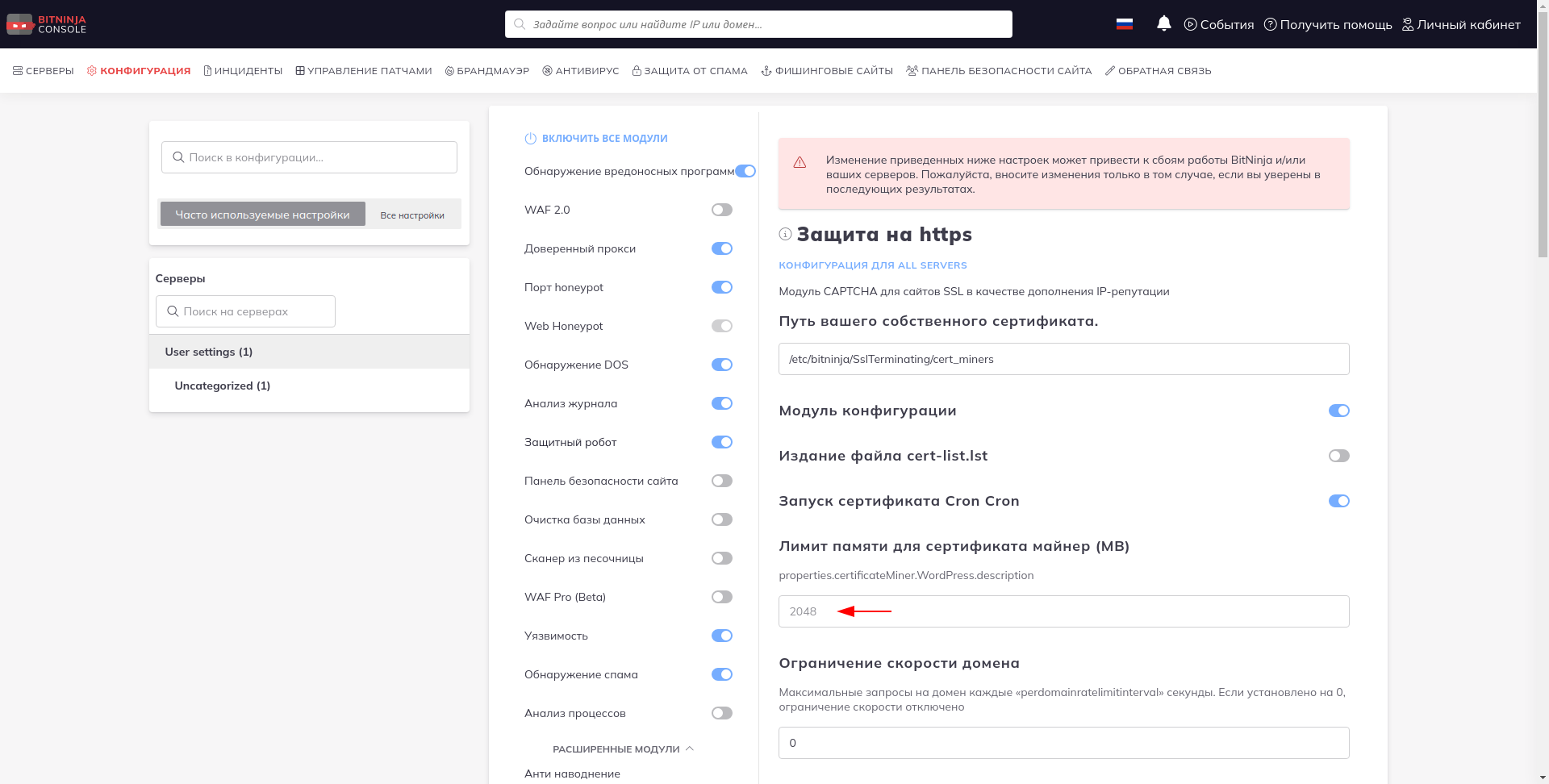 Конфигурация → Защита на https → Лимит памяти для сертификата майнер (MB)