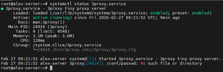 systemctl start 3proxy.serviceПроверьте статус сервиса: