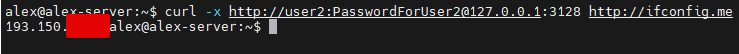 curl -x http://user2:PasswordForUser2@127.0.0.1:3128 http://ifconfig.me