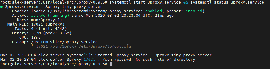 make installЗапускаем 3proxy и проверяем статус: