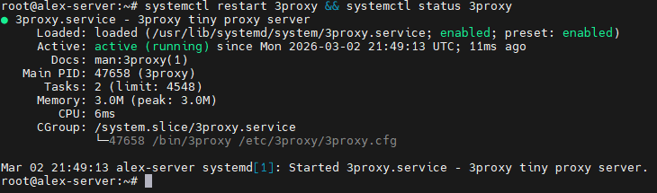 systemctl restart 3proxy && systemctl status 3proxyЕсли сервис успешно запустился, значит, ошибок нет, и новая конфигурация успешно применена.