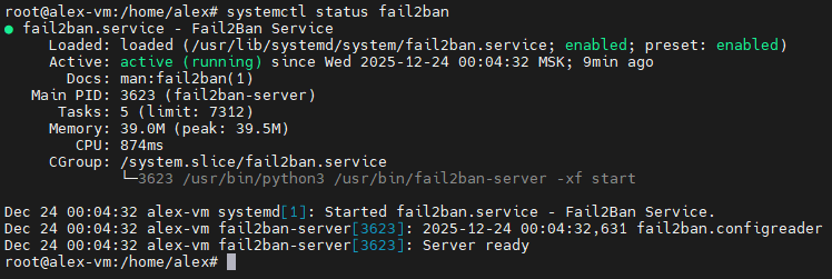 systemctl restart fail2ban- Проверьте статус сервиса:
