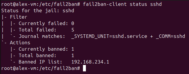 ssh alex@192.168.234.128Проверить список заблокированных IP можно с помощью команды: