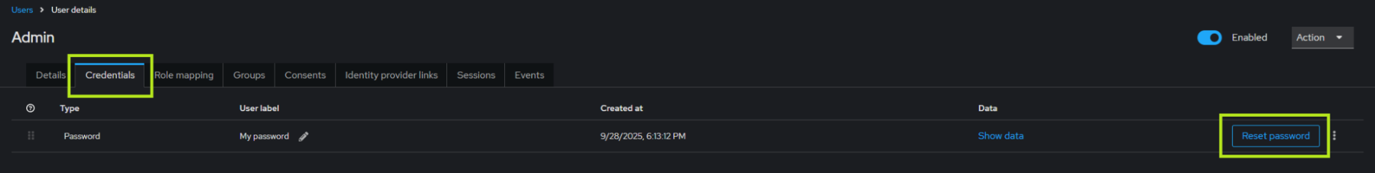 Зайдите во вкладку «Credentials» и нажмите на reset password: